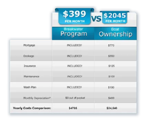 With Breakwater Boats & Yachts, you can save as much as $600 per month and over $24,540 a year over boat ownership. It’s based on the same boat costs as our vessels. A great advantage of our membership program is that you can schedule and use a great boat when you want, at a fraction of the cost.